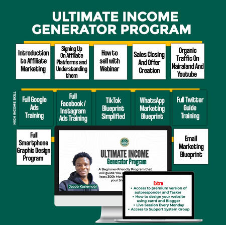 WELCOME TO THE ULTIMATE INCOME GENERATOR MENTORSHIP PROGRAM.You are about to learn how to turn your phone into an ATM and start making 300k π΅π΅π΅ or more monthly with just your smartphone and internet connection.You are about to begin your journey to make your first 300k in one month or less. You are about to learn how top affiliate marketers make massive sales & all the money while newbies are struggling. Please:do not proceed past this stage if you are not ready to make money onlinedo not proceed past this stage if you think life is a joke & you are not serious with your life.