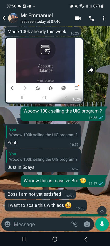 WELCOME TO THE ULTIMATE INCOME GENERATOR MENTORSHIP PROGRAM.You are about to learn how to turn your phone into an ATM and start making 300k π΅π΅π΅ or more monthly with just your smartphone and internet connection.You are about to begin your journey to make your first 300k in one month or less. You are about to learn how top affiliate marketers make massive sales & all the money while newbies are struggling. Please:do not proceed past this stage if you are not ready to make money onlinedo not proceed past this stage if you think life is a joke & you are not serious with your life.